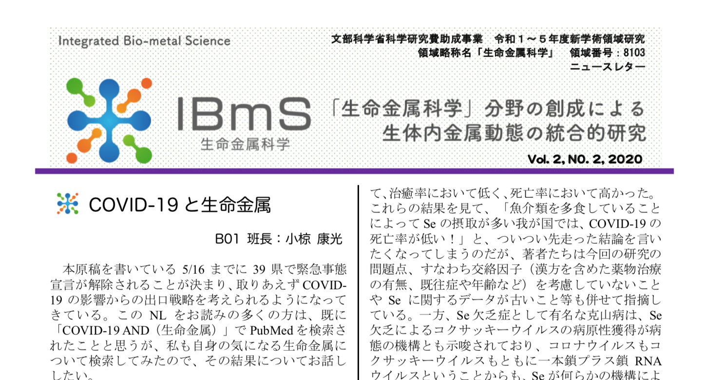 ニュースレター第10号の発行:Our 10th Newsletter Issued ニュースレター 2020.06.262021.09.30 領域のニュースレター(第10号)を発行しました。 生命の“半”金属元素戦略:高野先生(A01-3班 大阪府立大学) こちらからダウンロードしていただけます。